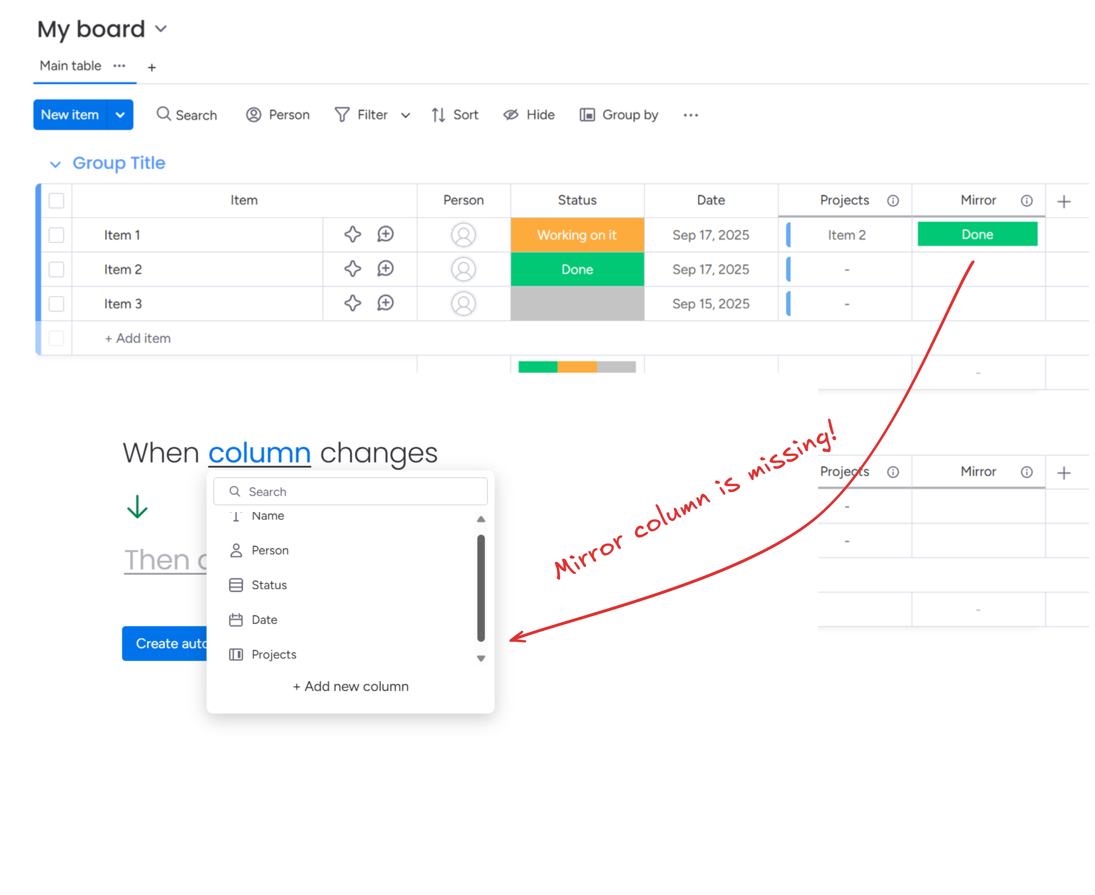 - They don't trigger automations. You can't use "when mirror column changes" as a trigger in native monday.com automations.
