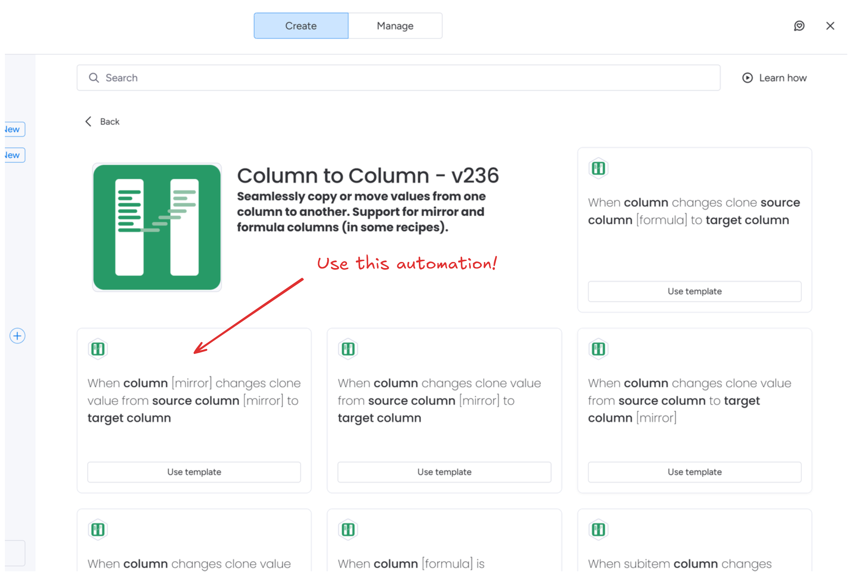 - Open automations and find the Column to Column recipes