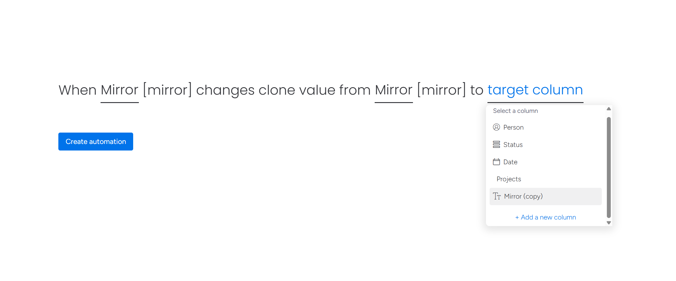 - They can't be used as automation inputs. Conditions like "when mirror equals X" simply don't exist for mirror columns.